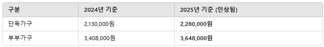 • 2025년 단독가구 선정기준액: 2,280,000원